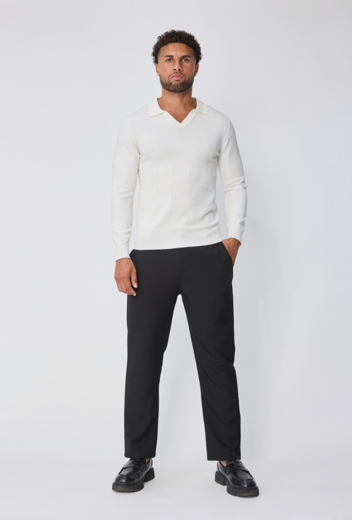 Slim Fit, fehér galléros hosszú ujjú póló, magában mintás, gumis egyenes alsó szegéllyel