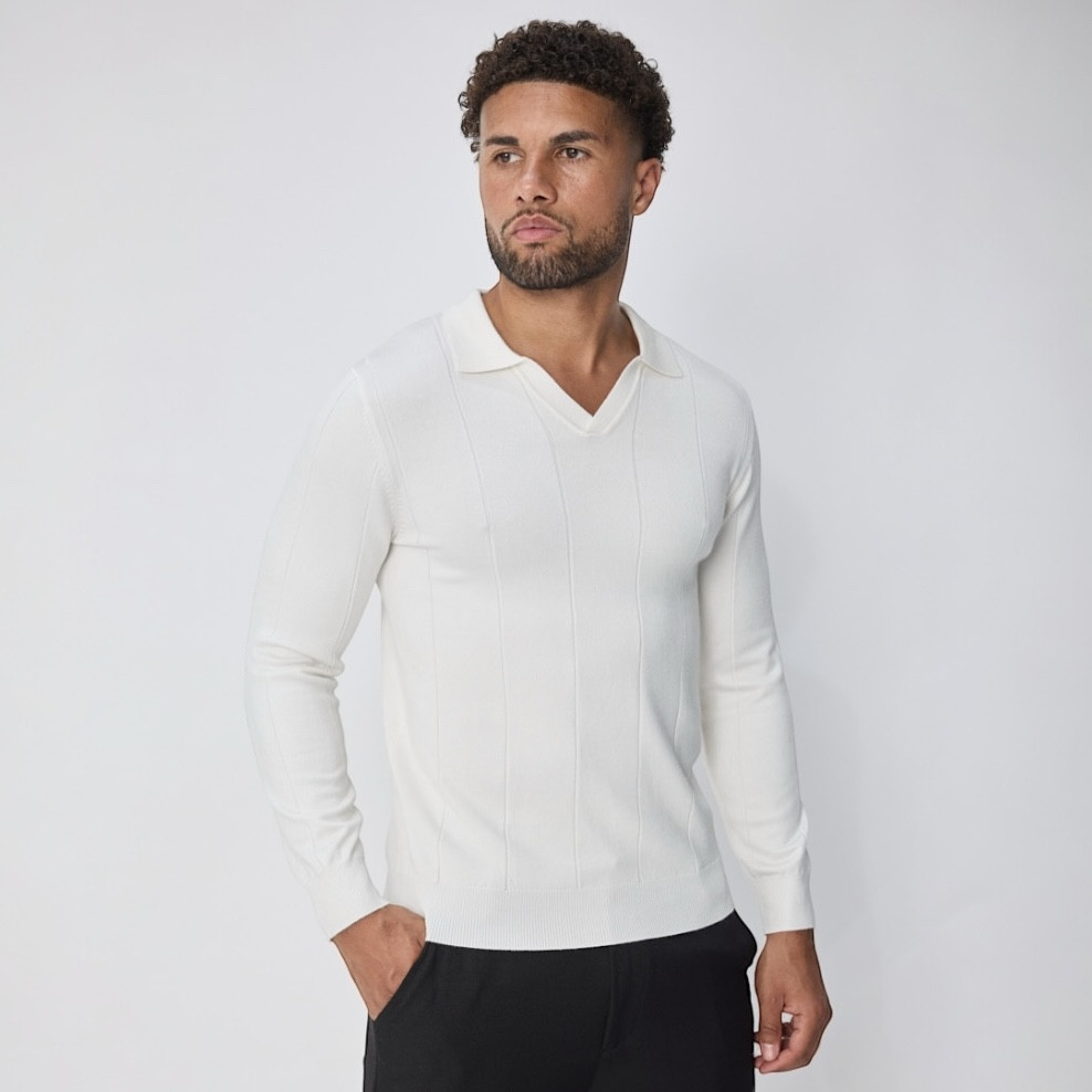 Slim Fit, fehér galléros hosszú ujjú póló, magában mintás, gumis egyenes alsó szegéllyel
