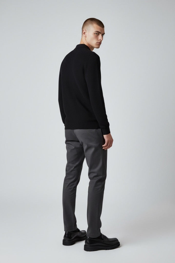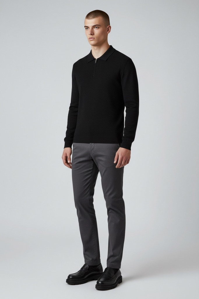 Slim Fit, fekete galléros hosszú ujjú felső, rövid cipzárral, finoman strukturált felülettel