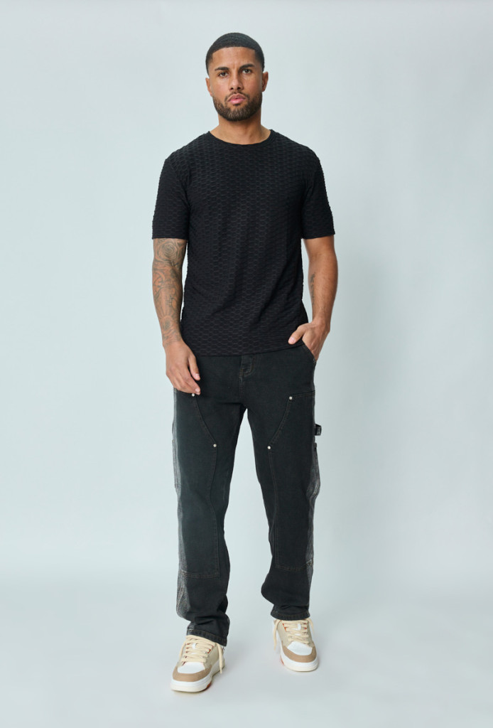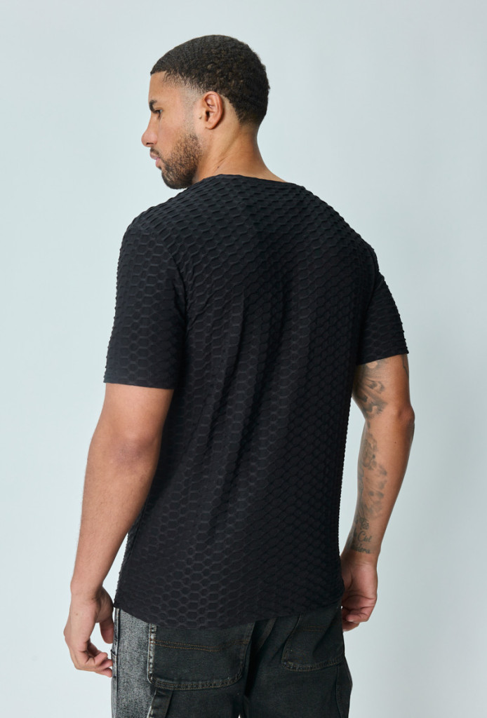 Slim Fit, magában mintás fekete hosszított póló, környakkal és egyenes alsó szegéllyel