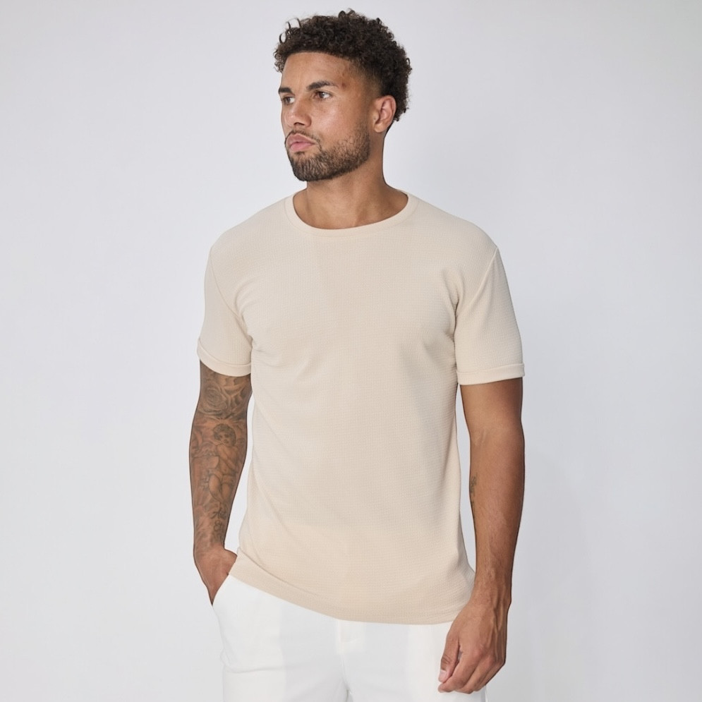 Slim Fit, bézs színű, texturált póló, visszahajtásos ujjal, környakkal és egyenes alsó szegéllyel