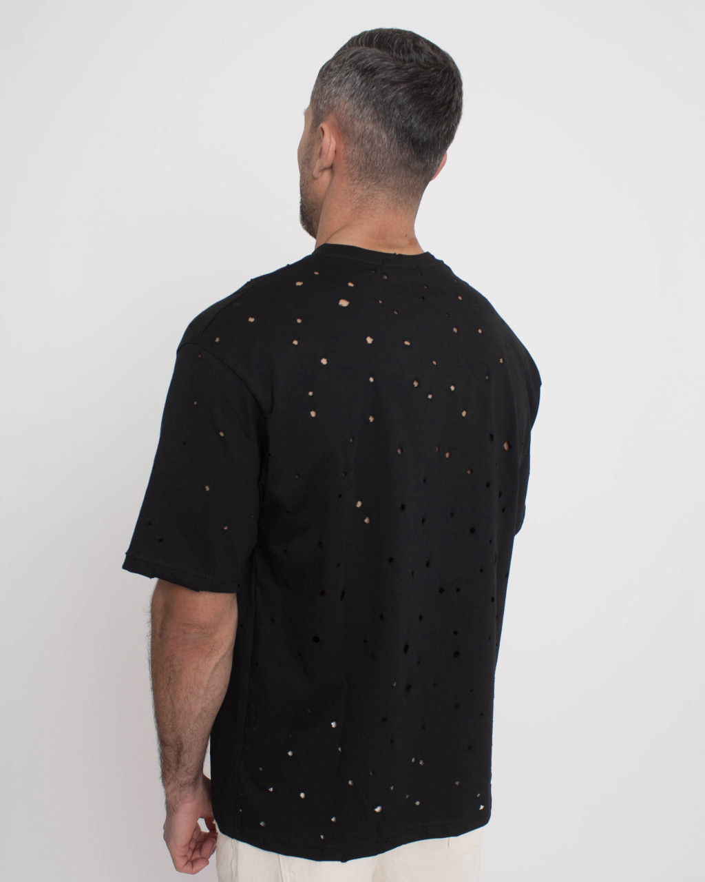 Oversize, laza fazonú fekete póló, elöl-hátúl szakított ( lyuggatott dizájn ) részletekkel, ejtett vállal és egyenes alsó szegéllyel