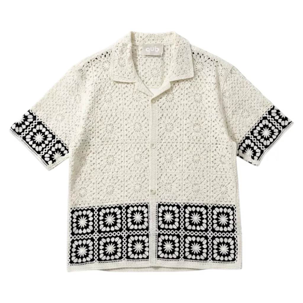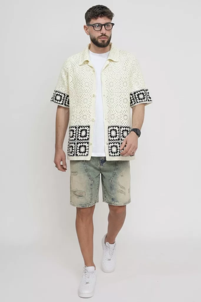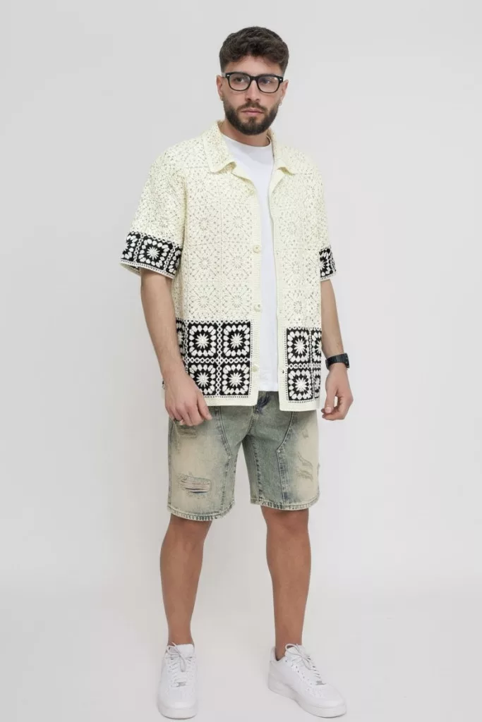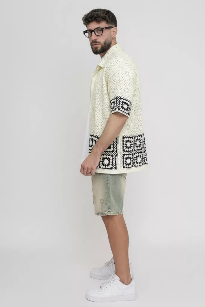 Regular Fit szabású horgolt , áttört szerkezetű textil ing, gallérral, gombos záródással és egyenes alsó szegéllyel
