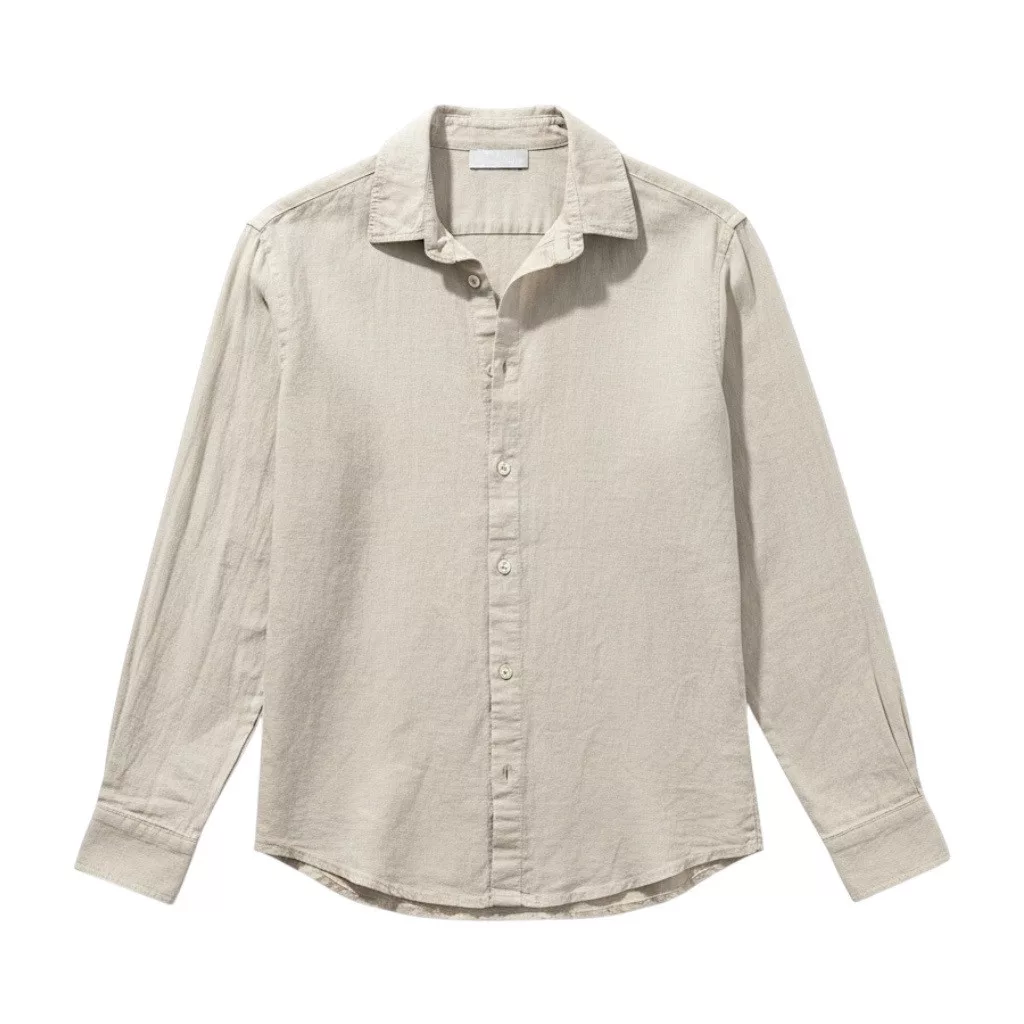 Slim Fit, bézs hosszú ujjú , vékony len anyagú ing , gallérral, gombolható kézelővel, lekerekített alsó szegéllyel