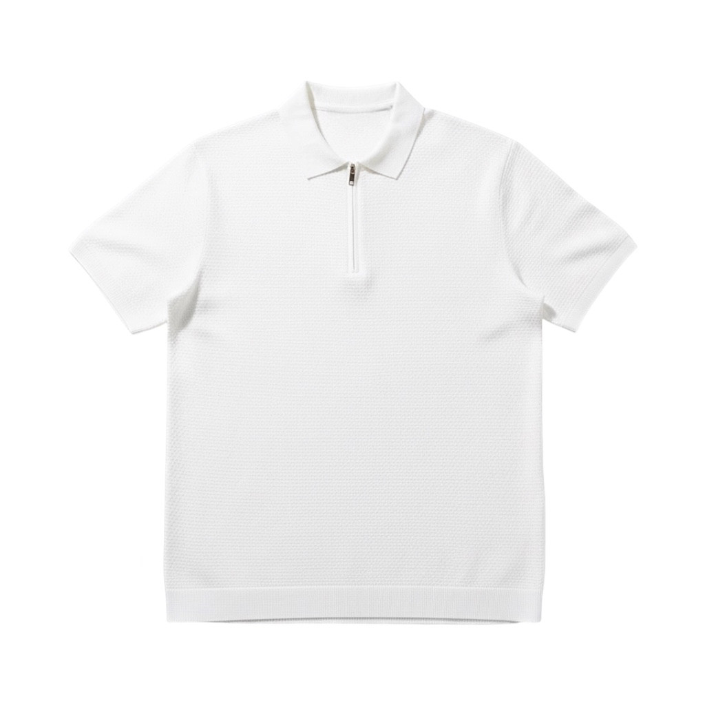 Slim Fit szabású, fehér galléros magában mintás kötött póló, puha vékony anyagból, gumis kézelővel és alsó szegéllyel