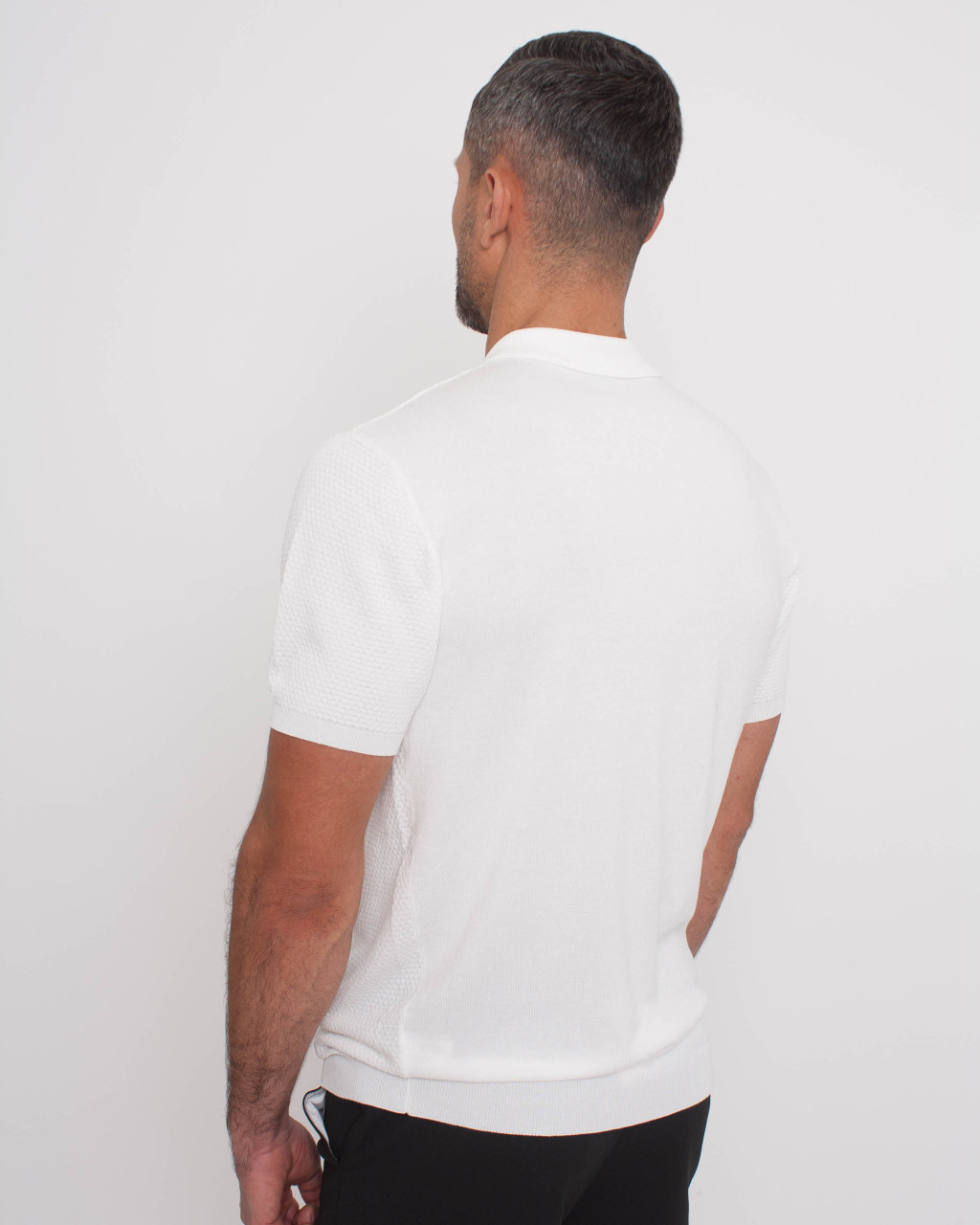 Slim Fit szabású, fehér galléros magában mintás kötött póló, puha vékony anyagból, gumis kézelővel és alsó szegéllyel