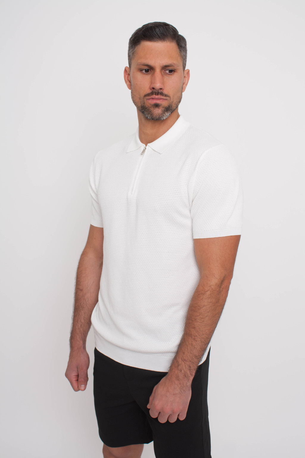 Slim Fit szabású, fehér galléros magában mintás kötött póló, puha vékony anyagból, gumis kézelővel és alsó szegéllyel