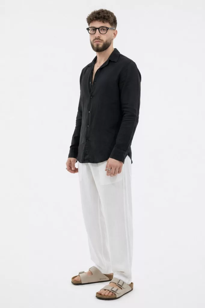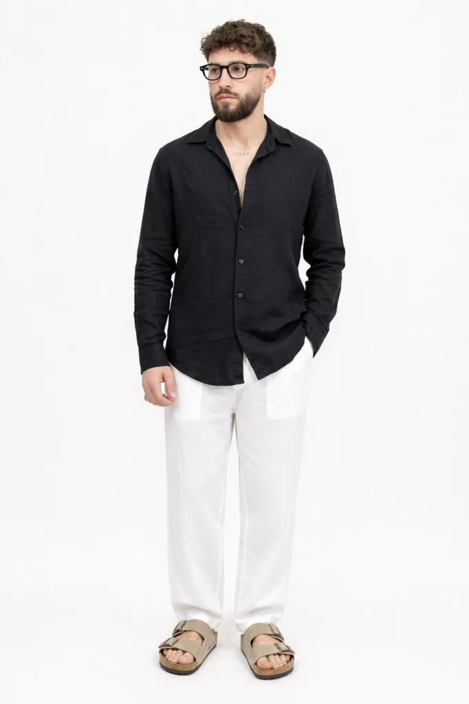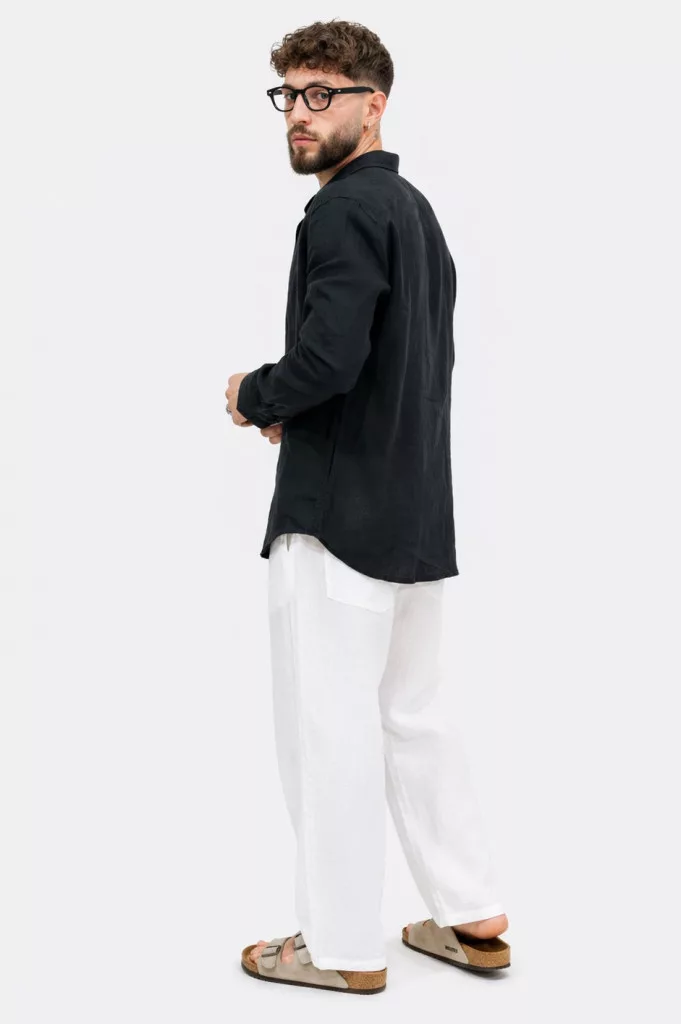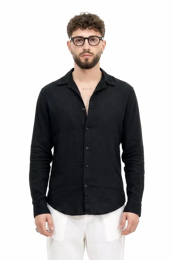 Slim Fit, fekete hosszú ujjú , vékony len anyagú ing , gallérral, gombolható kézelővel, lekerekített alsó szegéllyel
