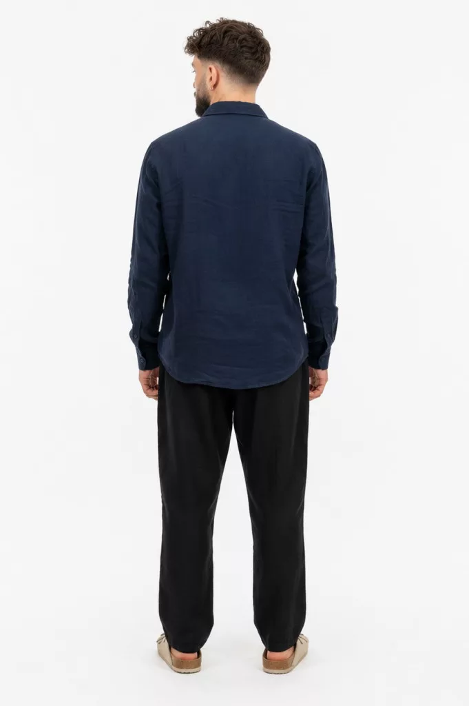 Slim Fit, sötétkék hosszú ujjú , vékony len anyagú ing , gallérral, gombolható kézelővel, lekerekített alsó szegéllyel