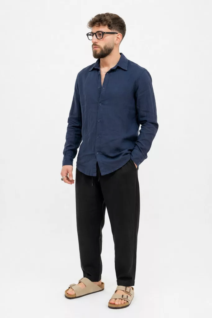 Slim Fit, sötétkék hosszú ujjú , vékony len anyagú ing , gallérral, gombolható kézelővel, lekerekített alsó szegéllyel