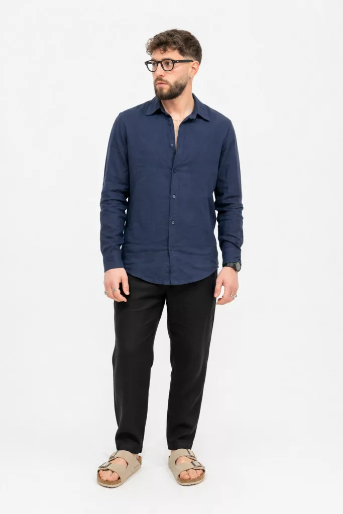 Slim Fit, sötétkék hosszú ujjú , vékony len anyagú ing , gallérral, gombolható kézelővel, lekerekített alsó szegéllyel