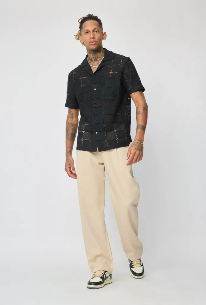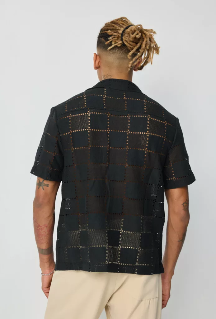Regular Fit szabású, fekete kötött hatású, áttört szerkezetű textil anyagból, gallérral és gombos záródással