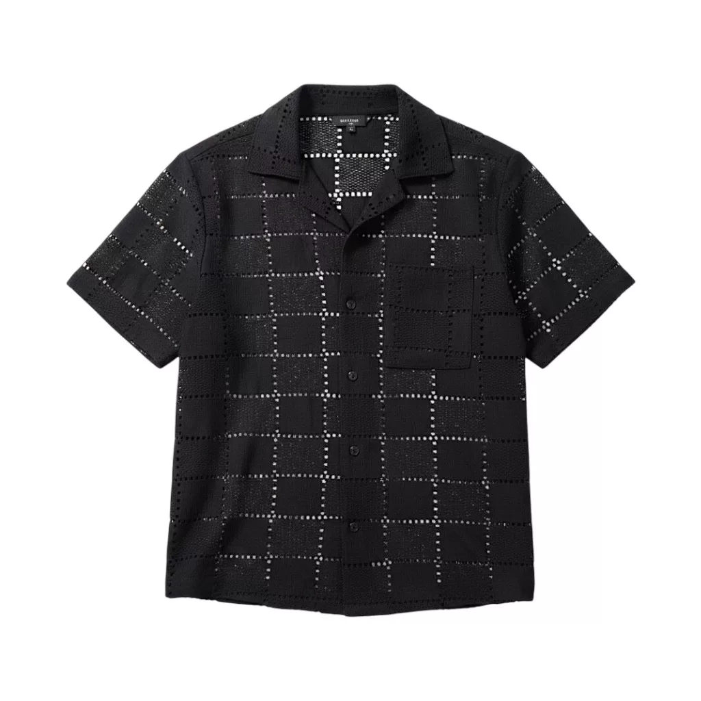 Regular Fit szabású, fekete kötött hatású, áttört szerkezetű textil anyagból, gallérral és gombos záródással