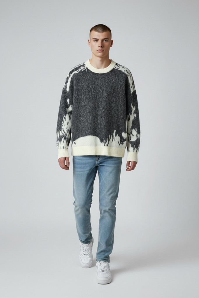 Regular Fit szabású, laza, szürke mintás gyapjúkeverék pulóver. Környakkal, gumis kézelővel és alsó szegéllyel.