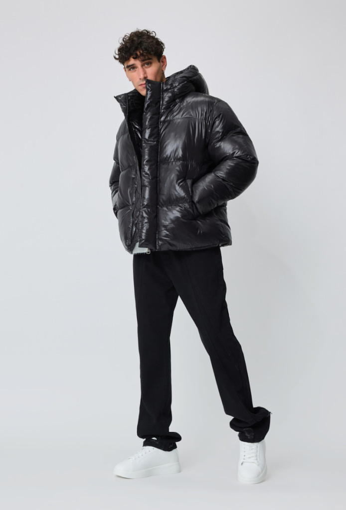 Regular Fit, laza szabású , fekete fényes kapucnis téli dzseki, két cipzáros zsebbel, gumis kézelő, egyenes alsó szegéllyel