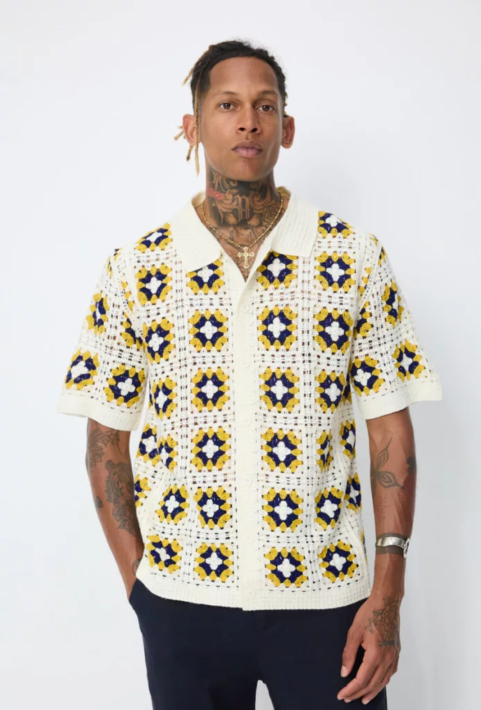 Regular Fit szabású, vastagabb anyagból készült horgolt struktúrált textil ing, gallérral, gombos záródással és egyenes alsó szegéllyel