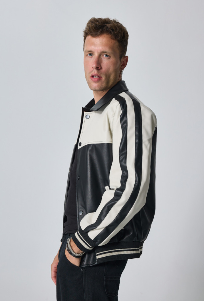 Regular Fit, fekete-fehér színű kontrasztos műbőr dzseki. Gallérral és patentos záródással. Oldalt zsebekkel és egy belső zsebbel. Csíkos bordázott szegélyekkel. Modern és karakteres darab, amely egyszerre ad elegáns és streetwear hangulatot viselőjének.
