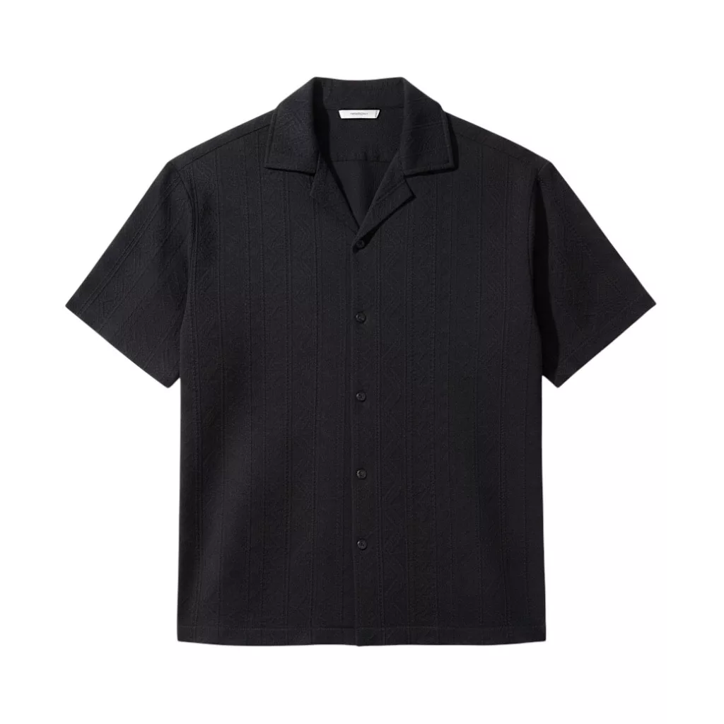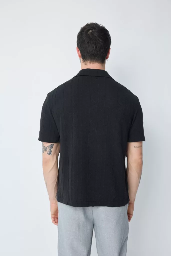 Regular Fit, fekete rövidujjú texturált ing, anyagában mintás, gallérral és egyenes alsó szegéllyel