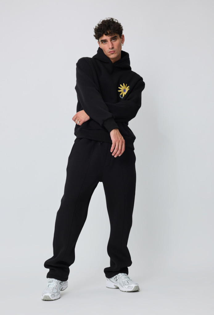 Regular Fit, fekete kapucnis pulóver, kenguru zsebbel, elöl-hátul mintával