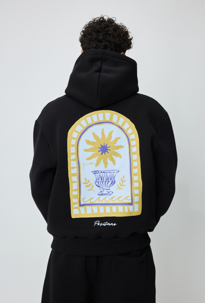 Regular Fit, fekete kapucnis pulóver, kenguru zsebbel, elöl-hátul mintával